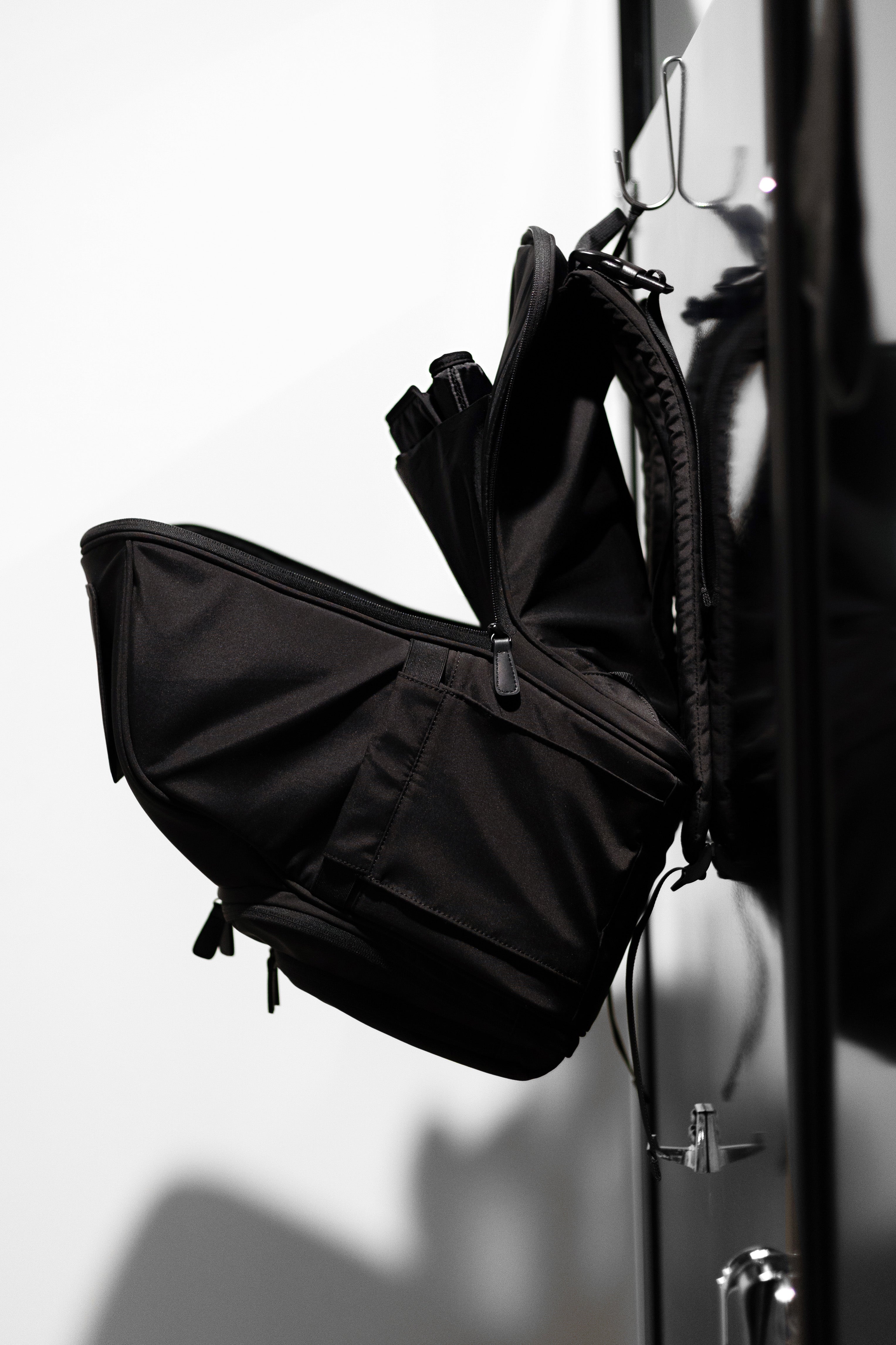 When opened, the bag hangs like a supply tray for easy access. Because in a public stall, no one's coming to save you.