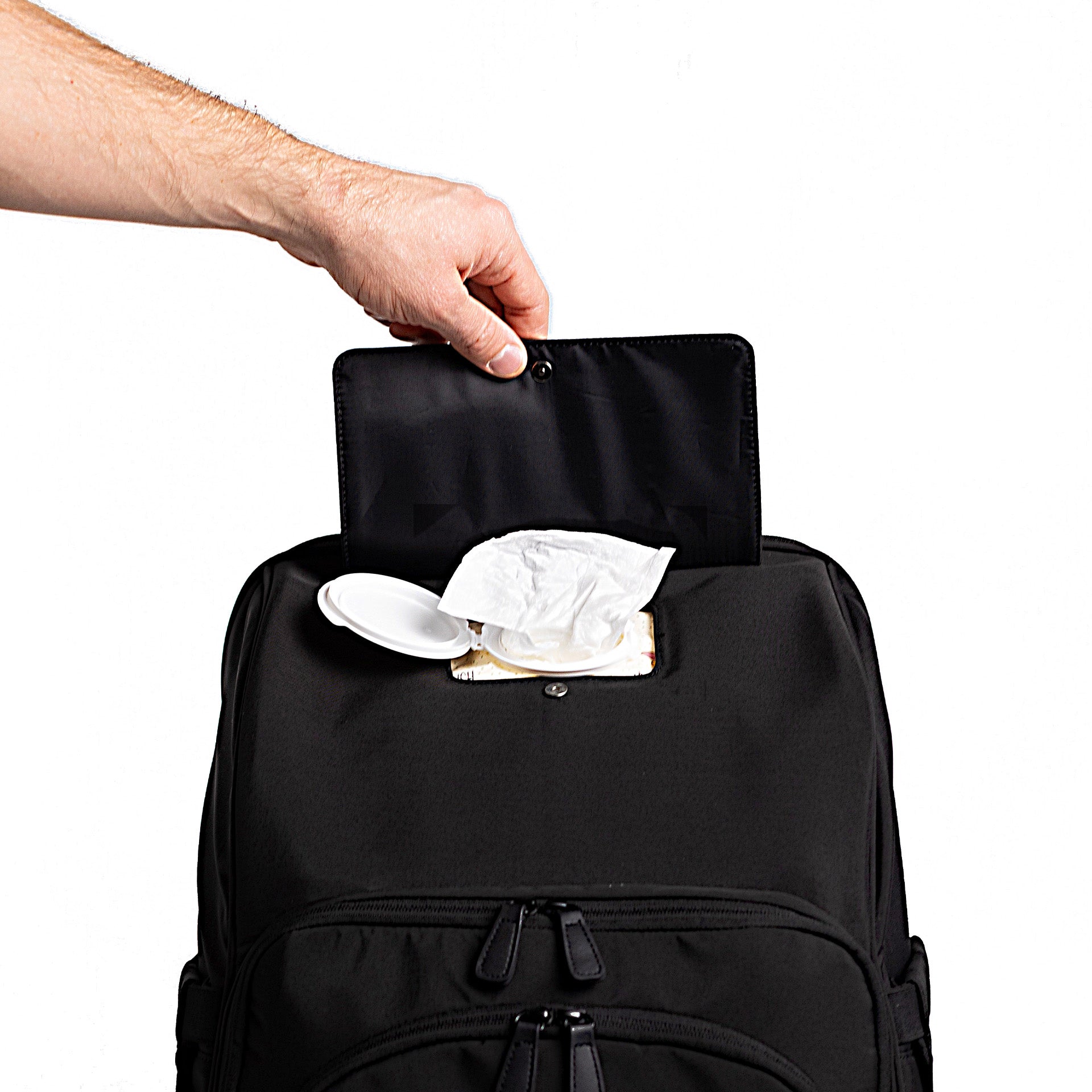 Help Yourself Suspension: When opened, the bag hangs like a supply tray for easy access. Because in a public stall, no one's coming to save you.